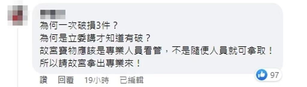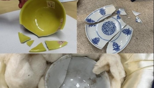 台灣網友評論。 在隨後台北故宮博物院社交賬號發出的一條配有“定窯白瓷劃花蓮紋梅瓶”插圖的宣傳帖文下,有網友留言“不要再摔破了”; 10月29日發布的一條介紹王世貞所收藏的書法作品宣傳貼文下,有網友更是調侃留言稱“這個摔不破,太好了”。 青花花卉盤碎成了好幾片 還有救嗎? 從台灣媒體曝光的圖片可以看到,“清 乾隆 青花花卉盤”碎成了好幾片,還有些細屑。 台北故宮博物院10月28日表示,破損瓷器目前第一件“明 弘治款 嬌黃綠彩雙龍小碗”正在修復中,第二件“清 康熙款 暗龍白裏小黃瓷碗”待修復人員處理,第三件“清 乾隆 青花花卉盤”待懲處程序完成,責任厘清後才會進入修復程序。 外界也關切,損壞的文物要如何修復? 台北故宮博物院修復室修復師林永欽曾表示,修復文物前要做基本調查跟研究,主要研究制作的技法之外,最重要的是知道哪些地方損壞,與器物處或書畫處說明並擬定計劃。除了肉眼觀察外,現在也會透過顯微鏡得到更多信息。 外傳損壞的這三件文物市值達25億元新台幣,台北故宮博物院院長吳密察則堅決強調“遠遠低於這個數字”。 據專業藝術鑒定學者估計,三件文物的市場參考值在2000至5000萬新台幣左右,但破損後即便可以修復,市場的估價也約為原價的一半左右。 除了修復被損壞的文物,不少人也關心其他的文物安全嗎?有保障嗎?