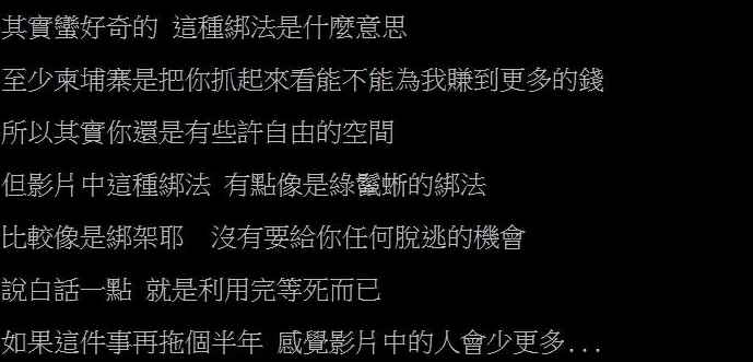 找工作竟被囚禁凌辱?“台版柬埔寨”駭人影片震驚了全台灣!香港新聞網11月9日電 台灣警方日前破獲一起求職詐騙案,發現多達61人被囚禁凌虐,其中3人死亡遭棄屍山區,猶如“台版柬埔寨”,引發社會嘩然! 昨日(11月8日)網上又傳出一段約20秒影片,疑是嫌犯視角拍攝,20多人擠在一個小房間,而且手腳都被銬住,再次震驚全台,也讓島內網友炸鍋,紛紛怒喊“有夠誇張”、“更像是綁架!”