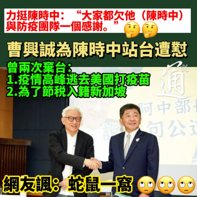 圖片製作:汪彥希 除了為陳時中站台,他還對中國國民黨發起攻擊。 就中國國民黨不承認台灣有“獨立、自主的政治權利”,曹與誠聲稱,這是在反對台灣“自主的主權”,又嗆聲中國國民黨台北市長候選人蔣萬安自稱有“抗中保台DNA”,但其父親蔣孝嚴卻跑去中國大陸吃吃喝喝,質疑“這到底是什麼DNA?”。 對此,中國國民黨台北市議員王鴻薇在社交平台發文揭發曹興誠兩次離開台灣的理由,一次為了節稅,一次為打疫苗,質疑這樣的人有多愛台灣? 王鴻薇在臉書指出,曹興誠30年前積極前往大陸,協助成立芯片廠和艦,甚至大力鼓吹“統一公投”,主張應從台海兩岸“事實上獨立、法理上統一”的現狀基礎上,以“統一公投”進一步謀求事實上的統一,被外界視為是統派、親中的代表。 曹興誠還曾兩次“拋棄”台灣。王鴻薇稱,曹興誠2011年入籍新加坡後,在台領取的股利稅賦由過去的40%降低為20%,節稅效果顯著。而第二次拋棄台灣,就是在去年6月島內疫情最嚴重時跑到美國去。雖然他聲稱說是看家人順便打疫苗,但當時就是全台疫情最嚴重、疫苗最恐慌的時候。 王鴻薇質疑,在這樣的背景下,過去兩次拋棄台灣的曹興誠,現在幫陳時中說公道話、開記者會助選?一個疫苗不夠就跑到美國去,為節稅就去做新加坡人,這樣的人懂得什麼叫公道? 曹與誠的一番操作,也把島內網友看懵了! 有網友將他與郭台銘做對比,表示“郭台銘:我愛台灣。沒疫苗?我自掏腰包趕快買個幾千萬劑大家用。曹興誠:我愛台灣。沒疫苗?趕快飛出台灣去打,打完再回來。這愛台灣的方式來比一比,看誰講話比較有說服力。” 有人則揶揄他力挺的陳時中,說“民進黨說抗中保台,實則引中犯台……解放軍從來沒有這麼靠近台灣過,就只在民進黨的無能下造成的 !” 亦有人提醒他這位愛台灣的新加坡人“忘了和艦案嗎?那時候把聯電的錢搬到大陸去……”直指他並不愛台灣,僅僅是愛新台幣。 曹興誠擔任聯電董事長時,與台積電創辦人張忠謀被稱為“芯片雙雄”,2001年時曾赴中國大陸投資。不過2022年3月,曹興誠突然轉變態度,大肆宣揚“兩國論”,8月還宣布捐出30億元新台幣,理由為抵禦大陸“侵犯”,加強台“防衛”。前後矛盾的作為,引發不少島內網友質疑。