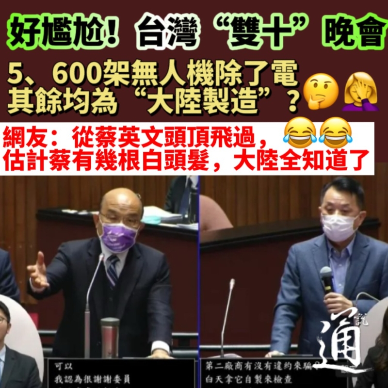 圖片製作:汪彥希 然而,前日(8日),中國國民黨“立委”魯明哲爆料,標榜台製無人機其實都是“大陸製造”。稱“金門來一台(大陸無人機),台軍就拼命(用石頭)打下來”,五六百台大陸無人機在蔡英文等人頭上飛過而不自知,可謂“台灣之恥”,要求台當局調查。 據台媒報道,從廠商出產的無人機,電池明顯可以看到大陸品牌名,下方更是寫了大陸製,就連螺旋槳支架上也是簡體字。機體、電池、控制系統、飛行圖樣、飛機韌體全來自大陸“高巨創新公司”。 對此,魯明哲諷刺說,“雙十”晚會當天,蔡英文致辭還提到今年8月嘉義已成立“亞洲無人機AI創新應用研發中心”,無人機產業將是未來的發展重點;游錫堃也以當晚無人機展飛的主題,呼籲台灣民眾“保護、捍衛台灣”。魯明哲直言“如今回想起來實在十分諷刺!” 他認為,台當局不允許廠商供應大陸地區標的,但台灣“希望創新公司”明知故犯,不僅無視台灣政策,用大陸無人機展演更是“讓台灣貽笑國際!” 此外,據指這批無人機沒有進口紀錄。有民眾質疑,若證實是大陸製,是否民進黨為省錢所以走私了“大陸貨”? 面對質疑聲浪,台“行政院長”蘇貞昌聲稱要下令徹查,“寧可不要有這種表演!”台防務部門負責人邱國正則回應稱,“只要是軍規的由‘中科院’(台灣)製作,那其他來講有一些軍規,那民間可以運用的我們就納入,但納入一定有條件,第一個他不能用大陸製品。” 若此次無人機證實為大陸製,無疑狠狠地打臉了台當局。 台灣時事評論員謝寒冰近日在節目中直指,“台灣80%的無人機產業,要麼根本用的大陸的無人機,要麼就是全部用的大陸的零件,因為現在全世界中國(大陸)產的零件最齊全、最便宜。你不用他(大陸)的,用誰的?” 事件曝光後,島內網友也議論紛紛。 有人笑稱,“原來民進黨跟大陸關係這麼好,真是一家親”,“騙神昌:震怒,怎麼這麼不小心被抓到了呢,這樣不就被發現我紅綠勾結了嗎?”還有網友嘲諷道,“從蔡英文頭頂飛過了,估計蔡英文什麼頭型有幾根白頭髮,說了什麼台灣機密,大陸全知道了。” 這已非島內第一次用大陸無人機被“抓包”了。2020年高雄跨年活動就被指燈光秀無人機是“大陸製造”。 【編輯:汪彥希】