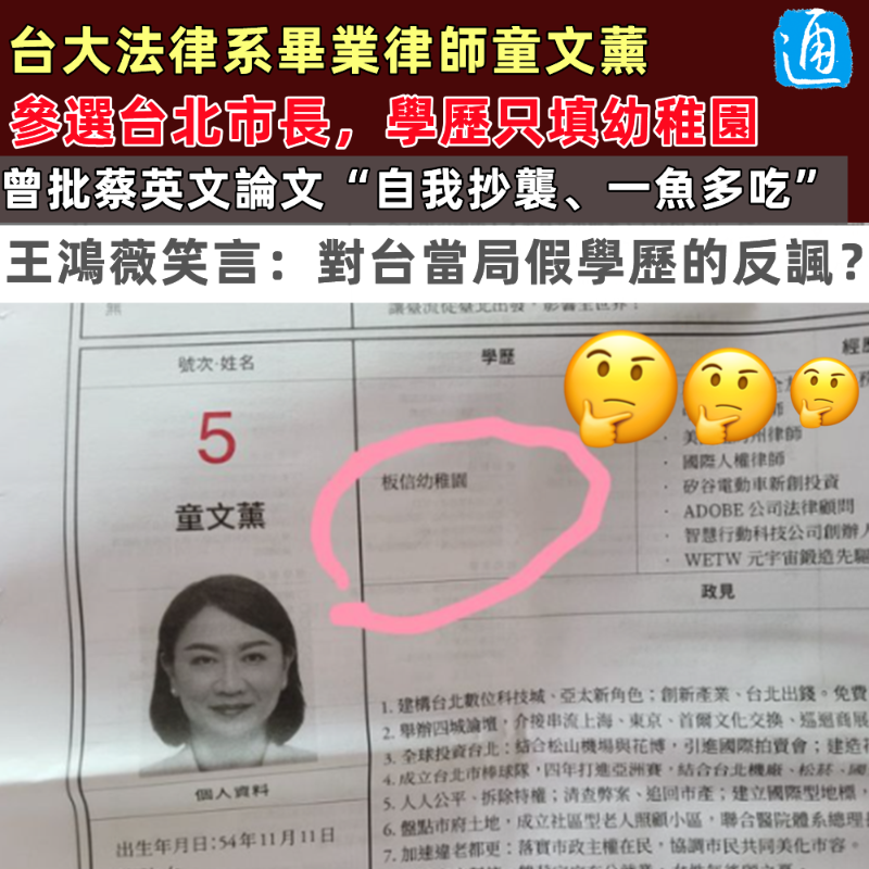 圖片製作:汪彥希 近日,台北市議員王鴻薇在選舉公報上發現台北市長候選人童文薰在選舉公報上的學歷只填上幼兒園,另一名候選人唐新民更亂填出生年月日.......對此,王鴻薇直言這是“選舉公報亂象”,並就童文薰的學歷填幼兒園笑問“這是對某些人假新聞的嘲笑和反諷嗎?” 王鴻薇今天(15日)在臉書上發文,貼出童文薰的選舉公報截圖,在童文薰的經歷部分,指出其曾擔任美國紐約州律師、國際人權律師、ADOBE公司法律顧問、硅谷電動車新創投資、指揮行動科技公司創辦人等等,經歷豐富。可令人大跌眼鏡的是,童文薰的學歷一欄,竟然只填上“板信幼稚園”。 今日,台北市長第8屆市長選舉候選人公辦政見發表會第二場登場,童文薰解釋了自己為何在學歷一欄只填“板信幼稚園”。她自述永遠是有一分證據說一分話,查過選委會資料,了解參選市長需要的學經歷是什麼,發現在學歷上並無任何要求。 童文薰還說,她認為與其和大家在論文的有無和真假上爭執毫無意義,對市政和台北的未來沒有任何幫助,所以她就直接以板信幼稚園的學歷參選。 根據童文薰在律師事務所網頁上的自我介紹,她的學歷為台灣大學法律系學士、美國太平洋大學麥克喬治法學院法學碩士學位,有台灣與美國紐約律師執照。 近年來,台當局屢次在學歷一事上出包,包括政客林智堅兩校碩士論文均被認定為“嚴重抄襲”,以及蔡英文博士學位真假難辨。 而童文薰就曾與島內新聞工作者楊憲宏一同赴台“監察院”陳情,批蔡英文論文“自我抄襲、一魚多吃”,嚴重違反學術倫理。 此次,王鴻薇曝光童文薰暗諷島內亂象後,有不少台灣網友紛紛在相關消息的評論區留言,表示“童律師的學經歷是實打實的,她的參選就是要酸爆塔綠班(民進黨)!”亦有人藉此暗諷蔡英文當局“只要不是假博士都ok”,“(填幼稚園學歷)這沒問題啊,只是反諷一群政治人物洗學歷。” 【編輯:汪彥希】