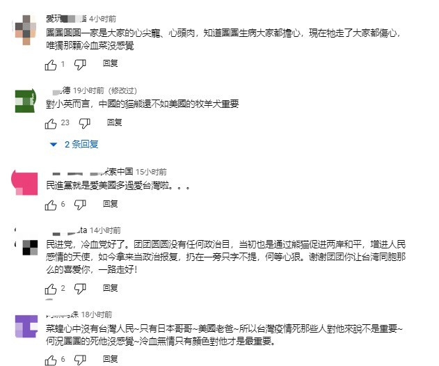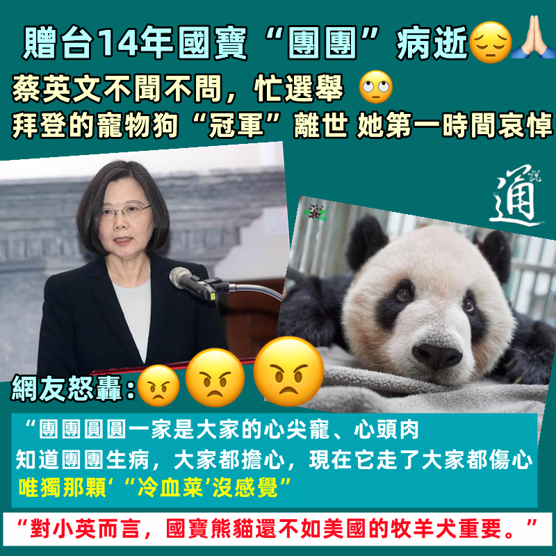 圖片製作:汪彥希 令人惋惜的是,贈台大熊貓“團團”於當地時間11月19日下午1點48分病逝,兩岸民眾皆感到不捨與惋惜,台北市長柯文哲等公眾人物亦紛紛通過不同形式感謝、哀悼“團團”14年來帶給台灣許多美好回憶。但現任台灣領導人蔡英文,仍“忙碌”在1126(台灣“九合一”)選舉當中,根本無暇關注“這等小事”。 據台媒報道,今年已18歲高齡的“團團”於今年8月下旬突然出現癲癇、口吐白沫的症狀,9月18日被送往台灣大學附設動物醫院進行檢查,發現有腦部水腫、壞死現象。後續由於病況不斷惡化,大陸還曾派專家赴台探視,但“團團”的狀況仍舊時好時壞,最終於19日清晨連續三度癲癇發作,當地醫療團隊決定含淚放手,讓“團團”在深層麻醉狀況下離世。 “團團”的狀況,時刻都牽動著兩岸民眾的心,但身為台灣領導人的蔡英文,始終是不聞不問,對於“團團”離世,她亦沒有任何吊唁之詞......中廣董事長趙少康於11月20日怒批蔡英文這種不聞不問的行為,十分冷血!備受爭議的蔡英文,隨後派出其辦公室的發言人張惇涵速速反酸趙少康“只想到政治的統獨藍綠,並引用趙的原話回嗆‘意識形態把人性淹沒,可悲可懼’。” 到底是誰“可悲可懼”?趙少康指出,蔡英文在現任美國總統拜登(Joe Biden)的牧羊犬“冠軍”(Champ)離世後,第一時間留言哀悼,反觀在台14年的“團團”因病過世,蔡英文的冷血行為,到底是誰“沒有人性?”“崇洋媚外”。 對此,張惇涵還試圖打“感情牌”說團團伴隨著許多人的兒時回憶,她亦稱,對於團團的離開,包括蔡英文在內,很多人都感到難過不捨,也感謝台北市立動物園及醫療團隊盡力到最後一刻。 網島內友對於張惇涵的“解釋”並不買賬,對蔡英文的冷血行為更是憤怒,在相關網站留言道“不要把冷血的蔡和“團圓”一家拉在一起 “團圓”一家是台灣巿民的寶貝。”“團團圓圓一家是大家的心尖寵、心頭肉,知道團團生病大家都擔心,現在它走了大家都傷心,唯獨那顆冷血菜(蔡英文)沒感覺。”亦有人不捨惋惜道“台灣的大貓熊(熊貓)是大陸用送的,台灣人很珍惜,很多國家求之不得,光是租金就很昂貴。”來諷刺台當局的不懂珍惜。還有民眾質疑道“貓熊(熊貓)過世對我們台灣是一件大事耶!為什麼領導人都不發言啊?”