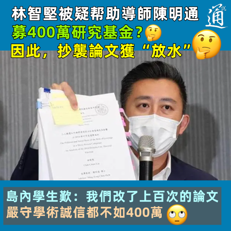 香港新聞網11月24日電 距離台灣“九合一”選舉僅有約兩天時間,跑選舉期間,島內最關注的莫過於新竹市前市長林智堅兩篇碩士論文均被判定為嚴重抄襲一事。至今,圍繞林智堅論文門,仍有一些疑問待解…… 台灣大學是島內最高學府,為何林智堅的抄襲論文能如此輕而易舉地通過?指導教師陳明通為何如此放水?