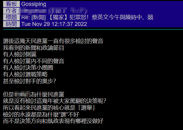 還有人在島內論壇PTT上發文砲轟,民進黨的核心就是“選舉”,檢討的永遠都是為什麼“選”不好,譬如今次從檢討側翼到選戰策略,甚至檢討對手,但就是沒說自己決策方向和執政表現有哪裡沒做好。所以各位可以看到,勝選的民進黨是在收穫果實,而敗選的民進黨在佈局下一次的選舉。