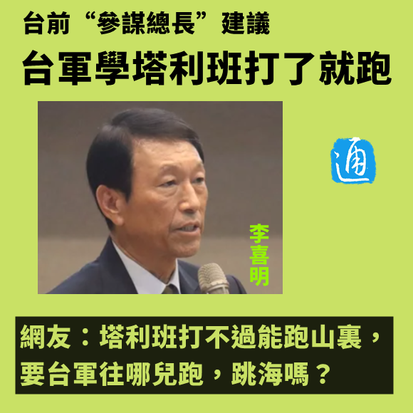 台前“參謀總長”建議台軍學塔利班打了就跑 網友:往哪兒跑,跳海嗎?香港新聞網11月30日電 “台灣需要有正確的戰略跟執行戰略能力,應參考波羅的海三小國跟阿富汗塔利班經驗,建立機動的‘防衛部隊’”,11月29日,台灣前“參謀總長”李喜明在一場座談會上如是說。他還特別指出,“(台軍)應該像塔利班一樣,打了就跑。” 此言一出,引來島內一片嘲諷:“有這種‘參謀總長’,還好是前任。”“最好的方式是投降。”“塔利班打不過能跑山裏,要台軍往哪兒跑,跳海嗎?”