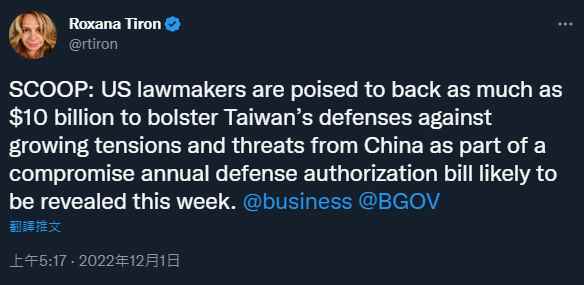 《彭博》記者發推稱美國擬對台軍援100億美元。(推特截圖) 《彭博》記者今天(12月1日)在推特發文稱,美國國會議員準備在新年度國防授權法案中,編列高達100億美元(約新台幣3067億元)預算,“以強化台灣的防衛能力,對抗來自中國大陸的日益威脅”,最快本周就會公佈內容。 根據《彭博》報導,該法案預定將納入數項旨在強化台灣軍力及美台合作的條款,內容包括100億美元的對台軍事援助,以每年20億美元(約新台幣613億元)核撥,直到2027年,遠高於美參議員提案同時期對台軍援的65億美元。 值得關注的是,該法案還允許美國從庫存中緊急撥放10億美元的軍事裝備給台灣使用,與軍援烏克蘭對抗俄羅斯入侵的程序類似。 依據這項措施,美國還會被授權建立一個區域性軍火儲備庫,美方將允許每年增加價值高達5億美元的資金,直到2025年為止。 而就在今年10月份,美國“紐約時報”曾刊登一篇標題為“美國欲將台灣變成巨大武器庫”的文章。內文引述美國多名官員指,華盛頓在研究解放軍演習後,正加強努力在台灣打造龐大的武器庫存。
