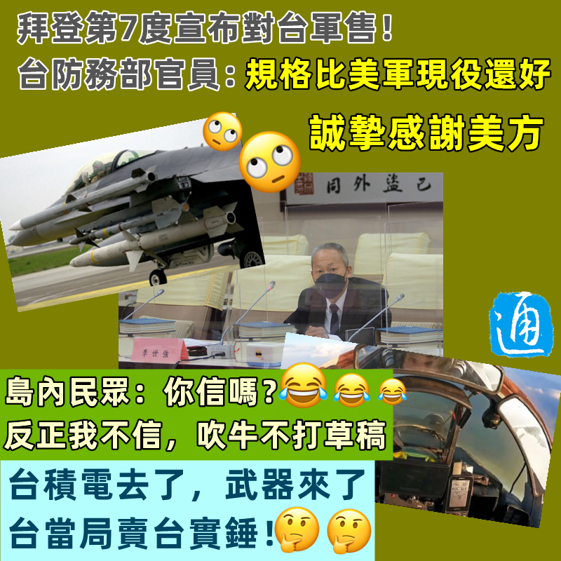 島內熱炒“拜登第7度對台軍售” 台當局炫耀:武器“比美軍現役還要好”!香港新聞網12月8日電 島內熱炒“拜登第7度宣布對台軍售”。為了證明美國賣給台灣的不是破銅爛鐵,台當局誇下海口,武器“比美軍現役還要好一點”……