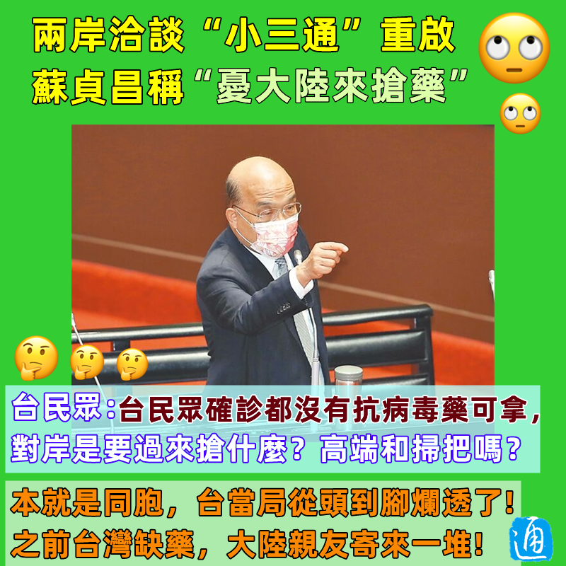 圖片製作:汪彥希 據了解, “小三通”催生人陳清寶與曹爾忠將於12月24日下午在台北發起“還我小三通”開創兩岸和平新局大遊行,號召全台的金馬鄉親踴躍參加,一起陳情遊行到台灣地區行政機構,要求盡快讓“小三通”復航。 眼見兩岸交流有望重啟,打“抗中保台”牌的民進黨當局坐不住了...... 綜合台媒報道,台“行政院”院長蘇貞昌聲稱,此時大陸疫情嚴峻,貿然重啟“小三通”恐怕會讓對岸民眾來台“搶藥”,導致另一道防疫破口。他還發表了一系列“奇談怪論”,像是台灣近三年來“防疫有成”,若造成破口,恐難以對台灣民眾交代。 台“衛福部”部長薛瑞元其後亦幫腔稱,不一定需要等到“小三通”重啟,中國大陸人士、台商回來才會增加藥物的需求,現在也有可能“搜刮藥物”寄去大陸。 至於現時有無在台陸人“搜刮”藥物寄到大陸,導致相關藥品需求量增加?薛瑞元僅說正在密切注意當中。 對於綠營反應,中國國民黨“立委”鄭正鈐強調,“小三通”是兩岸交流很重要的方式,現在國民黨“立委”陳玉珍也在溝通,盼“小三通”能够通航。雖然台“行政院”有宣布解封,但班機和兩岸交流完全不友善。 至於台“行政院”稱擔心大陸人到台灣可能會“搶藥”,而不想開放“小三通”, 鄭正鈐指出,擋到的不是大陸人來台,而是真正想要回台灣的台灣人。稱現在接近農曆春節,以航空來看,運量不够,“小三通”開放對於想要回台灣的民眾有非常大的幫助。 就連民進黨“立委”賴瑞隆都說,“小三通”讓兩岸之間去協商,只要對台灣整體有利,都能做推動;只要大陸和台當局溝通完畢,把規範做好,適度開放比照過去作法,應考慮重啟。 為了阻止兩岸交流,綠營政客可謂醜態畢露,甚至不惜拋出所謂“大陸人來台搶藥” 論…… 對此,不少島內網友都覺得好笑,在相關消息下留言:“真好笑,台灣民眾確診都沒有抗病毒藥物可拿,對岸是要過來搶什麼?”亦有網友“疑惑”問道,“是來搶台產的‘高端’(疫苗)?還是搶台軍作戰用的掃把?” 同時,還有人直指蘇貞昌所說的“大陸疫情反彈,若小三通重啟恐會造成疫情破口”是無稽之談,怒嗆“台灣當時死幾萬條人命是大陸來搶藥嗎?‘餵毒部’(台“衛福部”)真是會鬼扯。” 亦有島內民眾指出,“本就是同胞,台當局從頭到腳爛透了!還怕大陸來搶藥?之前台灣缺清冠一號大陸親友寄來一堆!” 民進黨當局將一切都操作成“抗中保台”,分割兩岸同胞的行徑實在令人無語...... 【編輯:汪彥希】