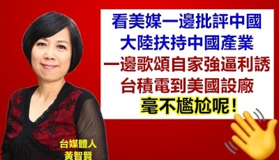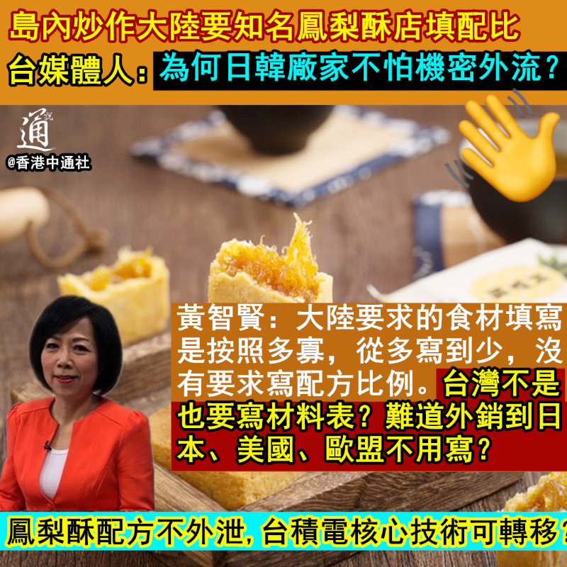 綠媒炒作大陸要台鳳梨酥機密配方?遭台媒體人連環KO!香港新聞網12月14日電 台灣出口大陸的產品因未完成重新註册要求而接連被禁,不出意外,民進黨當局不反思自己,仍執迷甩鍋大陸。近日,島內媒體更熱炒大陸要求知名鳳梨酥店佳德提供涉及商業機密的配方、填“鳳梨酥配比”。 其後,親綠人士爭相蹭起這波“配方門”,上演一出令人啼笑皆非的“抗中保台”戲碼...... 對此,台灣媒體人黃智賢今日(14日)卻在社交平台發文質疑,可是有媒體報道,大陸要求填寫的表格內容主要是關於工廠規模及食品成分,“台灣的食品工廠難道不需要填工廠資料?” 至於大陸要求的食材填寫,據指是按照多寡,從多寫到少,沒有要求寫配方比例。比如麵粉最多,就放在原料第一位,奶油第二多,就放在第二位。 “這樣有什麼問題?”黃智賢反問:“台灣不是也要寫材料表?難道外銷到日本、美國、歐盟不用寫?” 她強調,只有一樣東西,就是食品添加劑,要求詳實填寫比例。並舉例台灣早在2014年,就因出現食品安全問題而要求標示食品添加物。因此,大陸現時要求“標示食品添加劑的品項跟數量,有錯嗎......寫出食品添加劑的比例,不是更能保護消費者?”