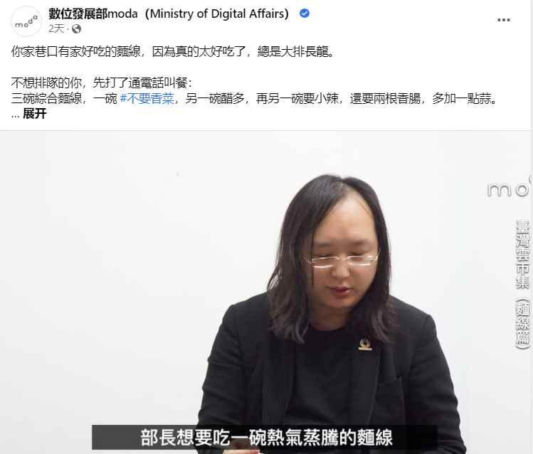 (截圖:取自台灣“數位部”臉書) 據台媒報導,台灣“數位部”近日在臉書貼出負責人唐鳳吃麵線的照片,藉此推廣“台灣雲市集服務”的點餐系統,稱讓民眾可在線上直接下單、付款,不止節省店家點餐收款的人力,還能開發新的客戶群體。 然而,當初成立“數位部”時,民進黨當局口口聲聲稱為了“提升資安”,甚至非常大手筆砸下218億預算,因此“吃麵線推線上點餐”貼文一出,立即引來大批台灣民眾留言大罵,質疑“數位部”浪費資源、亂花稅金! “看到幾百億的稅金這樣搞,我心中只有無盡的(髒話)” “抄襲黨現在抄襲到(外送平台)Foodpanda跟Uber Eats了嗎?” “原來是‘外送發展部’啊……” “花幾百億弄一個外送平台,難怪一直騙選票”