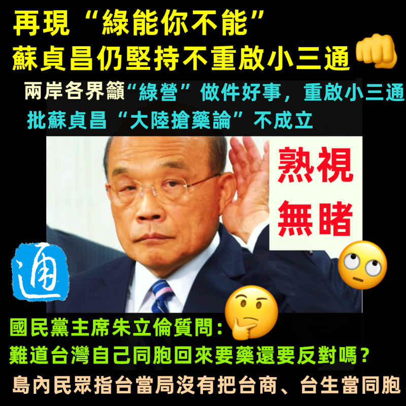 小三通難通!朱立倫喊話台當局:做些幫自己同胞的好事香港新聞網12月16日電 距離農曆新年越來越近,但小三通至今不通。台“行政院”院長蘇貞昌日前以“害怕對岸來搶藥”、“對岸疫情嚴峻,怕造成台灣疫情破口”等理由,反對開通小三通。亦有傳媒總結稱“萬事具備,只有蘇貞昌反對”……