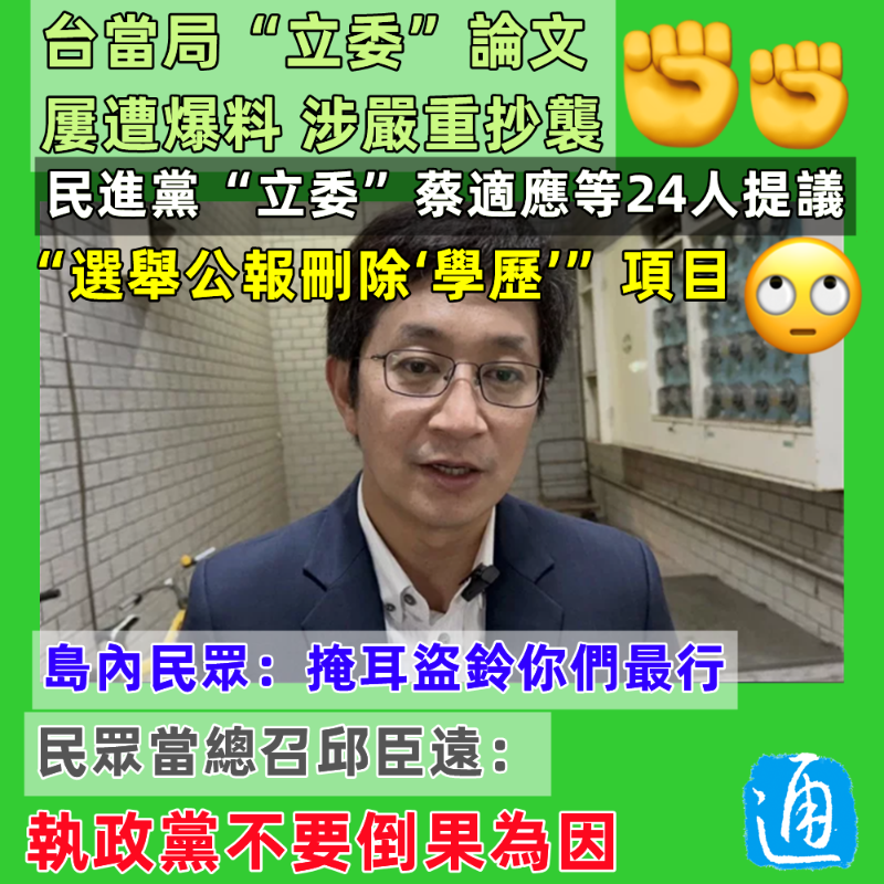 香港新聞網12月21電 前有民進黨“立委”、前新竹市市長林智堅被台大撤銷其碩士學位,後有桃園市市長鄭文燦論文被曝抄襲隨後被撤銷碩士學位,他們的指導教師為同一人——陳明通,他亦被揭發用同一份資料讓其學生寫論文,有9人論文雷同,涉嫌“一魚九吃”。不少人表示,民進黨在11月26日的“九合一”選舉中慘敗,陳明通為選舉破口之一,是失去年輕人選票的很大原因。 對於頻頻被爆料抄襲的民進黨當局,“聰明”的民進黨“立委”鍾佳濱、蔡適應等24人不僅提出了提排黑條款修法還增訂選舉公報登載前科,還悄悄要求將選舉公報中“學歷”項目刪除,這意味著讓選舉公報未來不用列出學歷。