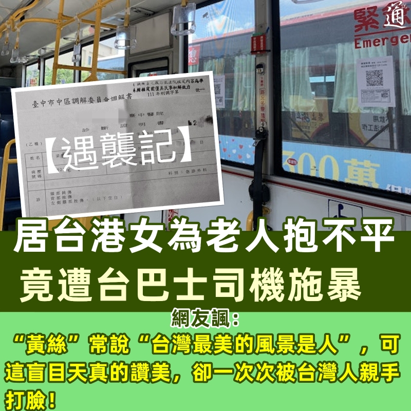 香港新聞網12月29日電 講個笑話,台灣最美的風景是人! 近日,一名居台的香港梁姓女插畫家,見巴士司機辱罵長者乘客,便見義勇為替老翁發聲,結果慘遭司機開車撞倒、拳毆致傷,事件在港台兩地引發輿論海嘯。 該名居於台中的梁姓女插畫家上周四(22日)發文爆料,自己當日上午乘搭巴士時,一名年近八旬的老翁因行動不便,上車時較緩慢,稍有耽誤時間,便遭司機破口大罵:“像你這種老人真不該搭公車!害我誤點!行動不便就該坐計程車!或者叫家人接送!” 席間一位女乘客仗義執言:“阿北(阿伯)又不是自己想行動不便,而且照顧乘客的需要,不就是公車司機的責任嗎?”但司機沒有理會,越罵越起勁,更叫老翁別再坐他的車。 梁女見狀為老翁打抱不平,出言理論,未料司機訛稱車壞了,並將所有乘客趕走。梁女無奈攙扶老翁過馬路時,卻發現司機企圖駕車離開,便衝向前與巴士司機對質,未料後者竟開車將她撞倒,更衝下車施暴,致其受傷。