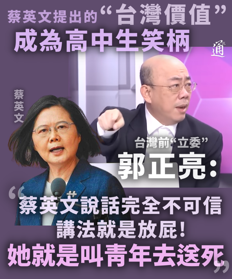 香港新聞網12月30日電 台灣地區領導人蔡英文早前宣布延長義務兵役期,由現行的四個月改為一年,讓島內青年馬上炸鍋,有高中生接受訪問時,更嘲諷說“謝謝蔡英文!我覺得我的台灣價值又提高了!”而對於蔡英文聲稱強化訓練內容,會增加刺針飛彈、標槍飛彈、紅隼火箭彈、無人機等新式武器訓練,台灣政府學者、前“立委”郭正亮出席節目時,直斥蔡英文說話完全不可信,“她的講法就是放屁”。 郭正亮透露,今年4月台防務部門就流出文件,規劃義務役兵一半編到海岸守備旅,“海岸守備旅是要決戰灘岸,卻叫只打過800發子彈的一年兵,去對戰受訓三年的解放軍,這是叫他們去送死嗎?”他又質疑蔡英文聲稱強化訓練,“真的每個人都可以摸到刺針嗎?標槍嗎?紅隼嗎?真的每個人可以接觸到無人機遙控訓練嗎?我們才買幾千發刺針飛彈而已,真的有這麼多訓練彈嗎?”(完)
