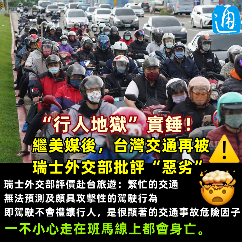香港新聞網1月5日電 繼美國CNN將台灣的交通環境形容成“行人地獄”後,瑞士外交部亦點名批評台灣交通惡劣。