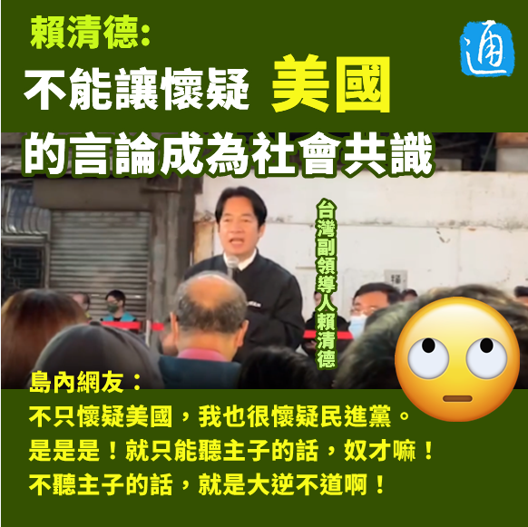 賴清德說“不能讓懷疑美國的言論成為社會共識” 網友懟:聽話的奴才分享到: