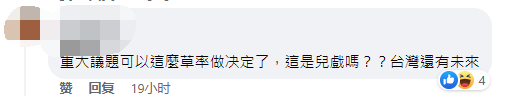 有網友批評台當局此番做法草率,“原來攸關(台灣)年輕人的權益是蹲在地上決定出來的!”、“這是兒戲嗎?台灣還有未來?”