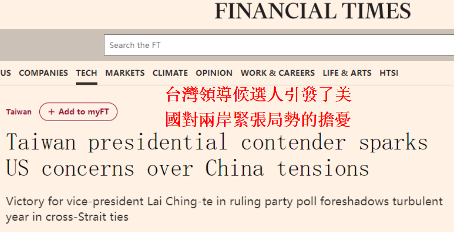 英國《金融時報》報道截圖 文章稱,在台灣地區領導人蔡英文辭去民進黨黨魁後,上周日,賴清德當選為民進黨主席。賴清德在台灣以外幾乎“不為人知”,如今卻登上了舞台的中心。賴清德經常被稱為“深綠”(即更激進的“台獨”傾向),這預示兩岸關係即將迎來更加動蕩的一年。 在最近台灣的民意調查中,賴清德的支持率略微落後於廣受歡迎的新北市市長侯友宜(國民黨)。 但是,如果國民黨提名其主席朱立倫為台灣地區領導候選人,賴清德將被視為競選的最大贏家。 與蔡英文不同,賴清德的主要支持者都在南方,即支持“台獨”的中心地帶。他曾自稱“‘台獨’工作者”,雖然隨後又添加了“務實”二字,即“務實‘台獨’工作者”, 但這已經影響了外界對他的看法。 賴清德一再公開表示,台灣是一個“主權獨立的國家”,并在與外國政要的閉門會議上經常提到這一點。