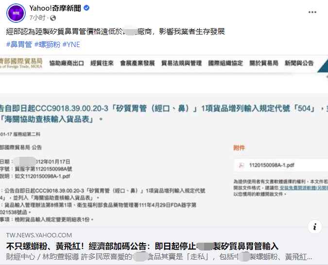 台媒報導。(圖:截自臉書) 台灣經濟部門“國際貿易局”昨晚(1月17日)發佈公告,指大陸製矽質鼻胃管,因不符合“台灣地區與大陸地區貿易許可辦法”第8條第1項第2款所列對產業無重大不良影響之條件,即日起停止輸入。 針對這項最新禁令,台灣經濟部門負責人王美花今天(1月18日)受訪時聲稱,因醫材公會提出大陸製產品有低價競爭的問題,官方經過一定機制審議後,決定禁止“進口”。王美花還表示,這樣的管理機制行之有年。 據瞭解,2022年10月26日,台灣經濟部門“國際貿易局”副局長劉威廉曾與島內相關業者開會,討論大陸製鼻胃管是否應該停止輸台,原因是大陸製產品的銷售價格在台灣廠商生產成本以下,嚴重影響台灣業者生存發展。 不過,也有島內業者指出,台灣醫材多經核准才“進口”,成本不一定低,停止大陸製鼻胃管輸入,台灣價格勢必調漲,恐轉嫁給消費者,影響消費者權益。 據悉,這也是繼螺螄粉、麻辣花生後,台灣當局再次禁止大陸製產品輸台。