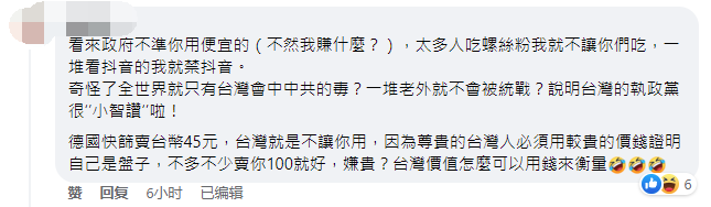 據過往報導,台灣民進黨當局近年不斷炒作“抗中牌”,只要跟大陸有關的事務,都劃在“統戰”範圍,並以此封殺了愛奇藝、抖音、小紅書等大陸APP。 有台灣網友就批評民進黨當局政治操作過了頭,太多人吃螺螄粉、看抖音,就下架螺螄粉、禁用抖音,並嘲諷:“奇怪了,全世界就只有台灣會中大陸的‘毒’?”同時以每劑45元新台幣的德國快篩為例,斥責民進黨當局為了一己私利,先讓台灣民眾深陷缺快篩的痛苦中,然後再以每劑100元新台幣販賣快篩,“嫌貴?台灣價值怎麼可以用錢來衡量?”