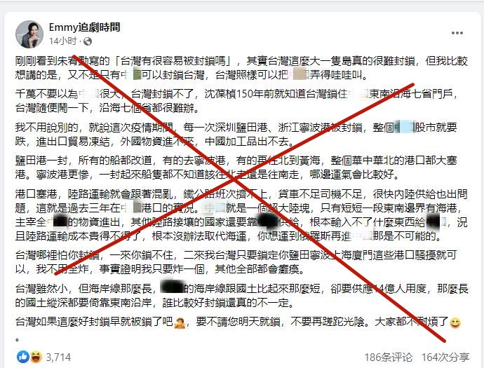 該“財經網美(網紅)”名為胡采蘋,長期在其個人臉書和台灣報刊發表“台獨”、反華言論,以此為噱頭博取關注。昨天,她在臉書上稱,其實台灣這麼大一隻島真的很難封鎖,并指“不是隻有中國大陸可以封鎖台灣,台灣照樣可以把中國大陸弄得哇哇叫”。 據她分析:“大陸就是一個超大陸塊,只有短短一段東南邊界有海港,主宰全大陸的物資進出。相比之下,台灣雖然小,但海岸線那麼長,大陸的海岸線跟國土比起來那麼短,卻要供應14億人用度,那麼長的國土縱深都要倚靠東南沿岸,誰比較好封鎖還真的不一定。” 她還稱,“台灣哪裡怕你封鎖,一來你鎖不住,二來台灣只要鎖定大陸的深圳鹽田、浙江寧波、上海、廈門這些港口騷擾就可以,我不用全炸,事實證明我只要炸一個,其它全部都會癱瘓。” 文末她甚至叫囂:“台灣如果這麼好封鎖早就被鎖了吧,要不請您明天就鎖,不要再蹉跎光陰。大家都不耐煩了。” 對此,島內網友也看不下去,紛紛表示,“到底是哪裡念的地理?大陸海岸線很短?乖乖當花瓶不好麼?什麼鬼都能評價軍事?”