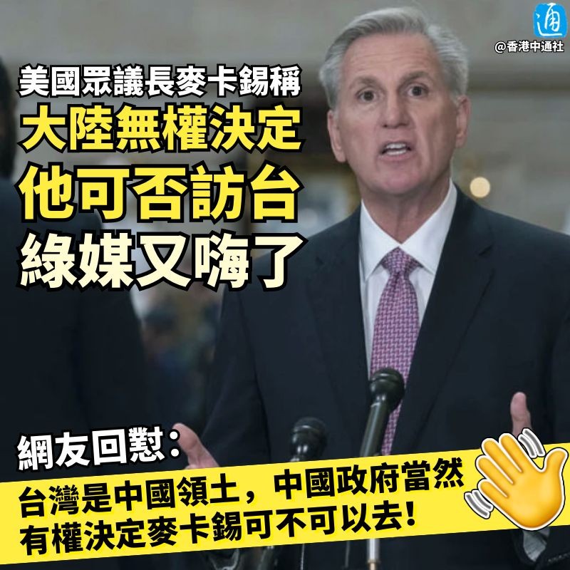 香港新聞網2月3日電 近段時間,島內瘋傳美國新任眾議長麥卡錫(Kevin McCarthy)將於春季訪台,台綠營及“台獨”勢力紛紛露出諂媚嘴臉大表“歡迎”,島內許多人卻擔憂此舉會讓台海緊張局勢再度升溫。 昨日(2日),麥卡錫在記者會上被問到,眾議院前議長佩洛西訪台引發大陸反制措施,是否擔心自己若前往台灣會升高台海緊張局勢?麥卡錫明確回應,“目前我沒有要去台灣的行程規劃”,但仍叫囂稱,“中國大陸對我能否去哪個地方毫無置喙的餘地。” 一句“無計劃訪台”無疑給一直炒作此事的綠營破了冷水,然而島內綠媒並不甘心就此放棄炒作“仇中”議題,又揪著麥卡錫所謂“大陸無權決定”的言論給“台獨”打雞血! 島內綠媒“三立新聞”同日在社交媒體發文,避而不談麥卡錫不來台灣一事,而是強調面對大陸警告,麥卡錫有力“回擊”稱“大陸不能決定我去哪”。 “自由時報”今日(3日)在社交媒體轉發相關報道並配文,聲稱“麥卡錫要不要來台灣,大陸哪裡管得著”,還嗆聲“小編中午想吃拉麵,也要大陸同意嗎?” 麥卡錫的狂妄言論及島內綠媒倚美自嗨的表現隨後引發大批網友不滿! 有網友怒懟麥卡錫及綠媒:“台灣是中國領土,中國政府當然有權決定可不可以去!”