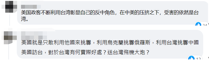香港中通社製圖 也有網友指出麥卡錫等美國政客頻頻釋放來台消息,純粹為了拉抬自己的政治聲望——“上次佩洛西竄台,搞得台灣勞民傷財,美國政客來除了嘴炮,一點實質性的好處都沒帶給台灣,這些政客倒是撈滿了聲望!” “美國竄台,對台灣有什麼實際好處?送台灣飛機大炮嗎?”島內網友擔憂在美國政客的操作下,台灣民眾會被推向戰爭邊緣。