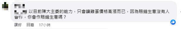 “以目前陳大主委的能力,只會讓雞蛋價格高漲而已,因為賠錢生意沒有人會做,你會做賠錢的生意嗎?”