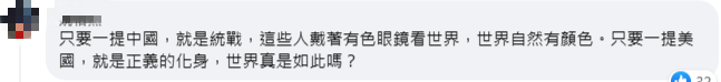 也有台灣網民一針見血地表示:“只要一提大陸,就是統戰,這些人戴著有色眼鏡看世界,世界自然有顏色。只要一提美國,就是正義的化身,世界真是如此嗎?”