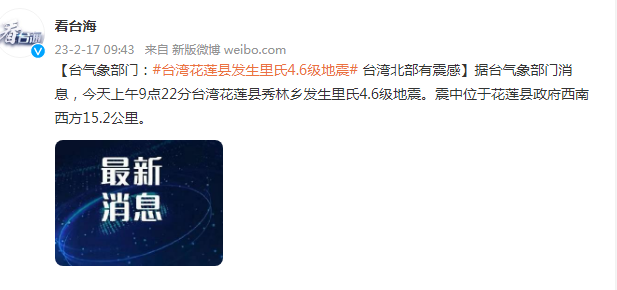 香港新聞網2月17日電 據台氣象部門消息,今天上午9點22分台灣花蓮縣秀林鄉發生里氏4.6級地震。震中位於花蓮縣政府西南西方15.2公里。