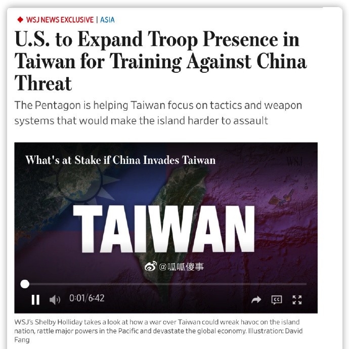 據美國《華爾街日報》報道,美國國防部將在未來幾個月增派軍事人員到台灣,加強對台灣軍隊的訓練計劃。 報道指,美國目前約有30名軍事人員在台,正考慮增加至100至200人。該報稱,美軍協助台灣軍隊擴大訓練,是美國協助台灣應對大陸的一環;該批新增的“駐台”美軍,將會訓練台灣軍隊操作美國武器,亦會指導其如何防範大陸的軍事戰略。 報道引述美方官員的話說,這次擴編“駐台”美軍已經部署好幾個月,甚至早在“中國氣球”事件發生前。而美國國防部發言人則表示拒絕置評。 “美國將擴增‘駐台’美軍”的消息傳入島內,綠媒嗨了,紛紛爭相報道,某報更是標題黨十足,直呼“‘駐台’美軍將擴增4倍,因應大陸威脅”!