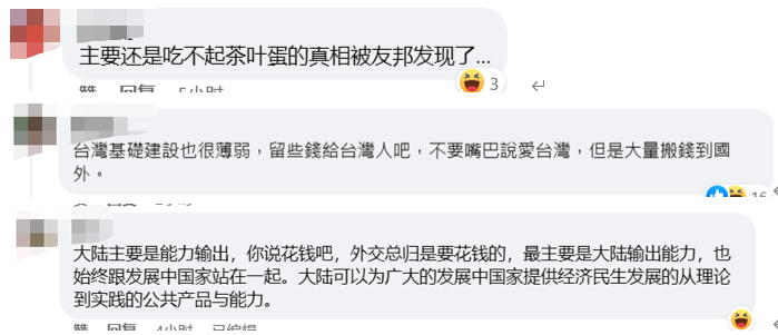 香港中通社製圖 洪都拉斯擬與中國大陸建交後,美國立刻跳腳,污衊“大陸許下很多未兌現的承諾”,警告洪都拉斯“美國將持續密切關注接下來的動向”。洪都拉斯要和中國大陸建交,和美國有何關係?黃智賢指出,如果在大陸幫助下,洪都拉斯可以找到自立自強的方式,能夠脫離以債養債的深淵、擺脫歐美的殖民經濟,那將是歐美最不願意看到的! 中美洲國家中,哥斯達黎加、巴拿馬、薩爾瓦多、尼加拉瓜相繼與台當局“斷交”,拉丁美洲的巴拉圭也有反對黨領袖表示若4月成功當選就和台“斷交”。黃智賢認為,與中國交好已成趨勢。 她提醒台當局要反思的不只是失去一個“邦交”,更要想想美國到底在全世界做了什麼事?“台當局跟著美國,要走到哪裡?還有什麼路可走?台灣人還有多少時間?” 在社交媒體上,網友紛紛留言力挺黃智賢發言。 有網友斥責台當局“打腫臉充胖子”:“台灣基礎建設也很薄弱,留些錢給台灣人吧,不要嘴巴說愛台灣,卻大量搬錢到國外!”“一昧用金錢做‘外交’,結果就是一個個‘斷交’。” 也有網友調侃洪都拉斯與台“斷交”是因為台灣吃不起蛋的真相被“友邦”發現了…… 還要網友點讚大陸為全球人民脫貧做出貢獻——“大陸輸出能力,也始終跟發展中國家站在一起,大陸可以為他們提供經濟民生發展的從理論到實踐的公共產品與能力!”