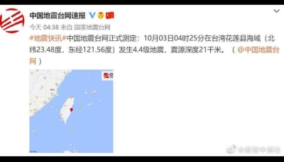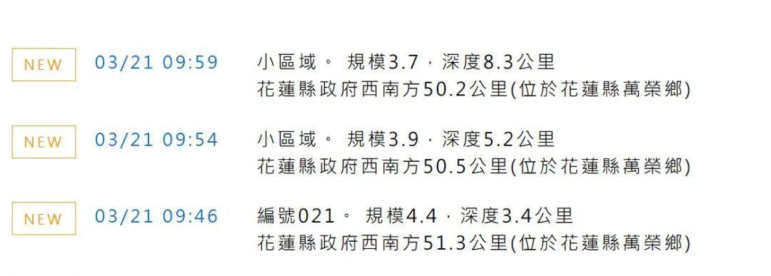 據看台海報道,據台氣象部門統計,地震發生後,9時46分、9時54分、9時59分台灣花蓮縣又相繼發生3次地震。