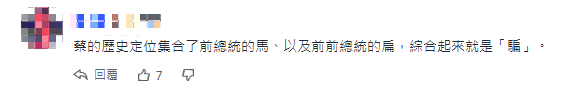 “蔡的歷史定位集合了前領導人的馬、以及前前領導人的扁,綜合起來就是騙。”