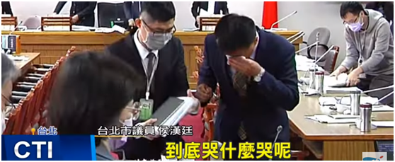 侯漢廷在節目中質疑陳吉仲(低頭抹淚者)到底哭什麼。視頻截圖 中時新聞網稱,有島內網友這兩天來跑到陳吉仲臉書下留言,諷刺他為自己陞官激動,“臉皮真厚”。還有網友說,“蛋貴豬肉漲價還陞官啊你?!”“該哭的是我們農民百姓才對吧”。