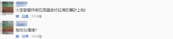 在臉書上,也有島內網友認為這些軍火商是“來拿錢的”、 “能撈盡量撈的概念,台灣盤子,世界怎麼跟得上呢?”還有人諷刺:“果然是美國的提款機”。↓