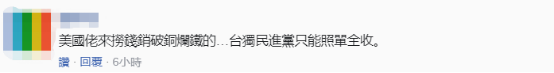 還有人認為,“美國佬來撈錢銷破銅爛鐵的…‘台獨’民進黨只能照單全收。” ↓