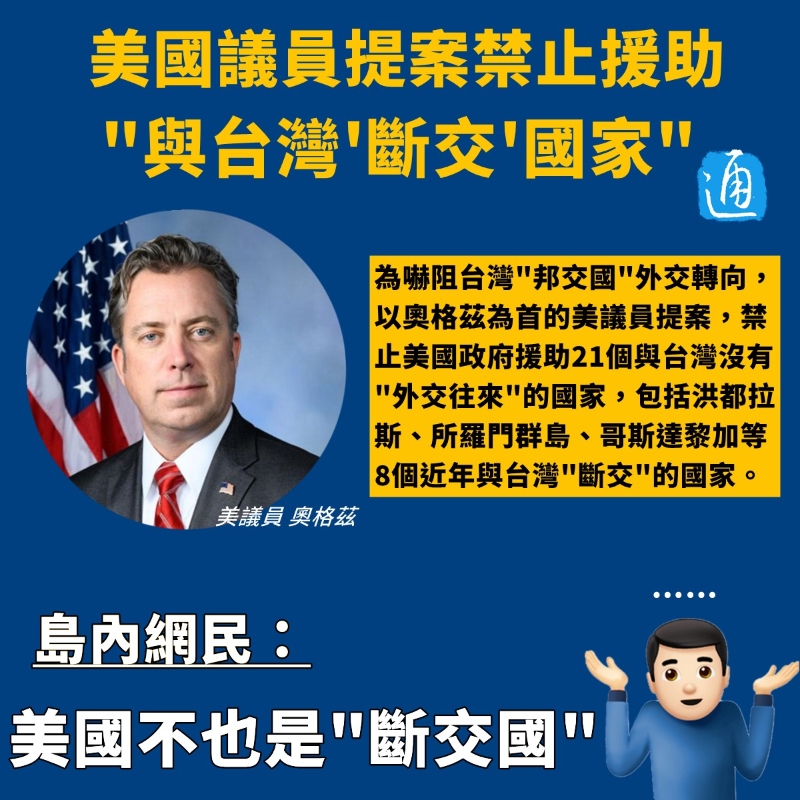 香港新聞網4月18日電 在洪都拉斯宣布與台灣“斷交”後,巴拉圭和危地馬拉也傳出或與台灣“邦交關係”生變。面對台灣這股“斷交潮”,有美國議員坐不住了,提案禁止美國政府對多個“與台‘斷交’國家”提供外援。 對此,島內網民紛紛質疑:“你不也是‘斷交國’……”
