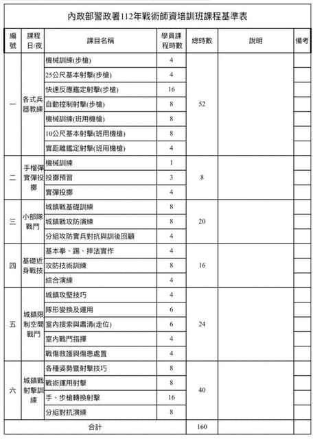 (圖片:台灣“警政署”臉書) 綜合台媒報道,為保護關鍵基礎設施,岛内傳出台灣“警政署”將擴編“保二總隊”成為“第二陸軍”,更外傳會配備“刺針”飛彈等武器,引發外界質疑“軍警不分”。 對此,台灣行政機構特意说明“現階段無相關規劃”,但並未否認擴編一事;台灣內政部門負責人林右昌則澄清指,“第二陸軍”是以訛傳訛,警察絕不會執行軍事行動。 然而,話音剛落,島內又曝光一份由台灣防務部門擬定的“戰術教官訓練計劃”,內容包括各式兵器教練、手榴彈實彈投擲、小部隊戰鬥、基礎近身戰技、城鎮限制空間戰鬥及城鎮戰射擊等,預計2023年5月起進行培訓課程。 教官接受完培訓後,再用30個月時間訓練5500名警力,“提升平戰轉換能力”。