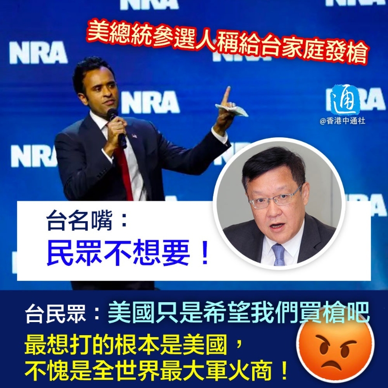 美國總統參選人、印度裔企業家拉馬斯瓦米(路透社) 台前外事官員介文汲指出,拉馬斯瓦米一番話看似瘋言瘋語,卻不是憑空而來,而是台當局給國際留下積極備戰的印象所致。 提議給台民眾發槍,拉馬斯瓦米不是第一人。早前,美國前白宮國家安全顧問奧布萊恩主張給台灣民眾發100萬支AK47步槍,隨後獲蔡英文頒授“特種大綬景星勳章”。介文汲指,蔡英文對奧布萊恩言行的認可,讓拉馬斯瓦米感覺到“商機來了”,才會在美國步槍協會發表此番言論,爭取支持度。 “你感覺很荒謬,人家覺得很合理,因為你們的領導人(蔡英文)就是這樣想的。”介文汲稱,“美國現在對台灣的印象就是,民眾每天枕戈待旦,等政府發槍,等大陸打來以後都拿著槍上街拼命。” 他表示,這些想法根本不是台灣民眾的想法,而是台當局留給國際的社會印象,這一切都是蔡英文為首的這些人造成的。 日前,台灣前文化部門負責人、作家龍應台投書美國《紐約時報》,稱台海局勢緊張之際,島內已普遍出現對立和相互指責的現象,這已對台灣造成傷害。她舉例稱,島內37位學者發表反戰公開信,呼籲尋找“中間路線”,批評美國的“軍事主義”,被攻擊為幼稚和軟弱;有農民朋友支持兩岸統一,因害怕被攻擊為通敵,不敢公開發聲......龍應台質疑,“如果國民黨獲勝,兩岸的緊張關係可能會緩解;如果民進黨繼續掌權,誰知道會怎樣?” 介文汲指出,龍應台是要告訴國際社會,台灣很多人是主張和平的。“現在的問題是,台灣外面的聲音進不來,裡面的聲音出不去,國際不了解台灣會做誤判,台灣不了解國際會做出笨事和傻事。”他呼籲,台灣民眾要趕快覺醒,該發聲就發聲;像龍應台這樣可以用英文寫文章的,趕快發聲,再不寫就來不及了。 拉馬斯瓦米的“送槍”言論讓不少美國網友傻眼,有人表示,“你現在的論點,讓全世界都覺得美國看起來很蠢!”還有一名網紅認為,這種給步槍的建議非常沒意義,“難道你要他們(台灣人)拿步槍,去射下對面打過來的飛彈嗎?愚蠢!” 台灣民眾則對拉馬斯瓦米的言論表示憂慮,有年輕人直言“很誇張”,“路上小屁孩拿到槍就會亂掃射吧。” “他只是希望我們買槍吧!”有台灣民眾嘲諷稱,“最想打的根本是美國,不愧是全世界最大軍火商。”