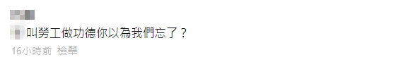 另有台灣網友提及賴清德“功德說”:以為大家忘了你叫勞工做功德? 2017年11月,賴清德任台灣行政機構負責人時,曾在一場公開活動中表示,若照服員(照顧服務員)覺得3萬新台幣的月薪太低,就當作“做功德、做善事”。此言引發社會反彈,網友紛紛戲稱其“賴功德”。