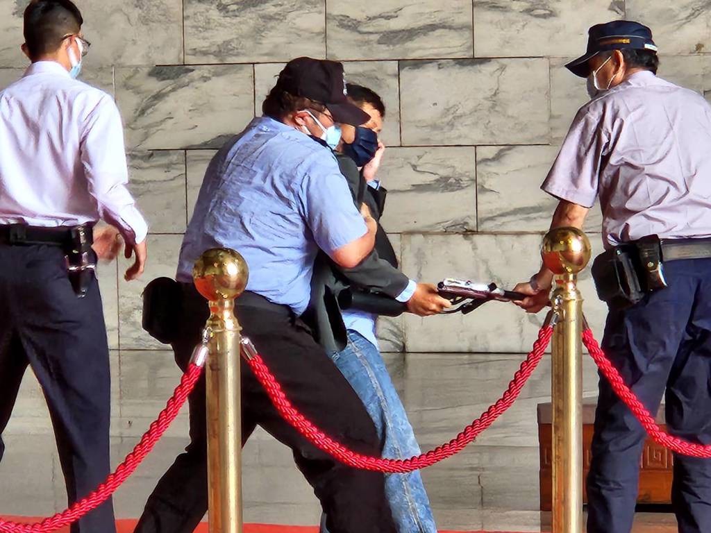 “台獨”分子闖中正紀念堂,持漆彈槍射擊蔣介石銅像,被警察帶走分享到: