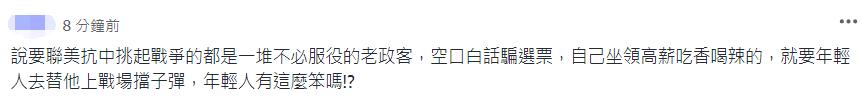 “說要聯美抗中挑起戰爭的都是一堆不必服役的老政客,空口白話騙選票,自己坐領高薪吃香喝辣的,就要年輕人去替他上戰場擋子彈,年輕人有這麽笨嗎!?”