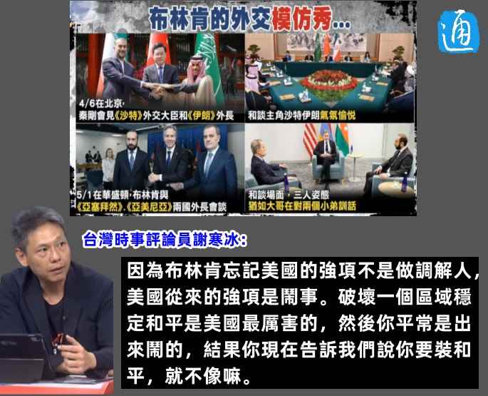 香港新聞網制圖 近日,在台灣一檔政論節目中,主持人分別對比了中美推動的兩次“和解”。 主持人介紹道,沙特阿拉伯和伊朗是世仇,結果在中國的斡旋下,中斷了7年關系的兩國走向和解。而且還是在北京宣布,沙伊兩國恢復了外交關系,並重開大使館。“最重要的是美國被蒙在鼓裡,大家跌破眼鏡。” 主持人接著說道,5月1日,美國國務卿布林肯讓亞美尼亞和阿塞拜疆兩國外長去華盛頓和談,“(和中國斡旋沙伊)是不是很像”。 主持人還讓觀眾仔細看布林肯和亞美尼亞、阿塞拜疆兩國外長的合照,忍不住笑道“只有布林肯是笑的,兩位外長的臉都好臭哦”。 主持人補充道,經過4天的談判,布林肯主持的這個和談,據說最後沒有達成任何和平的協議,“所以兩個外長是去給他當道具的嗎?” 主持人在評價北京協調沙伊時稱:“真是外交史上令人震驚,經典的一幕”,而談到布林肯,則稱這場外交模仿秀是有點尷尬啊。 對此,台灣時事評論員謝寒冰表示,他覺得布林肯會不會把事情想得太簡單呢?其實中國區協調沙特阿拉伯和伊朗之間,那個是非常非常困難的一件事情。因為阿塞拜疆和亞美尼亞,他們吵了幾十年,這兩個(指沙伊)吵了幾百年呢。那在這種狀況下,他能夠讓他們願意坐下來談,這事前的準備工作不知道準備多久,見面的時候也怕,會讓任何一方覺得委屈啊,覺得不被尊重啊,所以每一個細節都去想到。 謝寒冰強調,可是布林肯這個就不一樣,因為布林肯忘記美國的強項不是做調解人,美國從來的強項是鬧事。“破壞一個區域穩定和平是美國最厲害的,然後你平常是出來鬧的,結果你現在告訴我們說你要裝和平,就不像嘛。” 對此,不少網友認同謝寒冰的觀點,嘲諷布林肯根本是“東施效顰”。 【編輯:张丽欣】