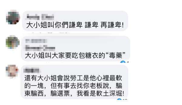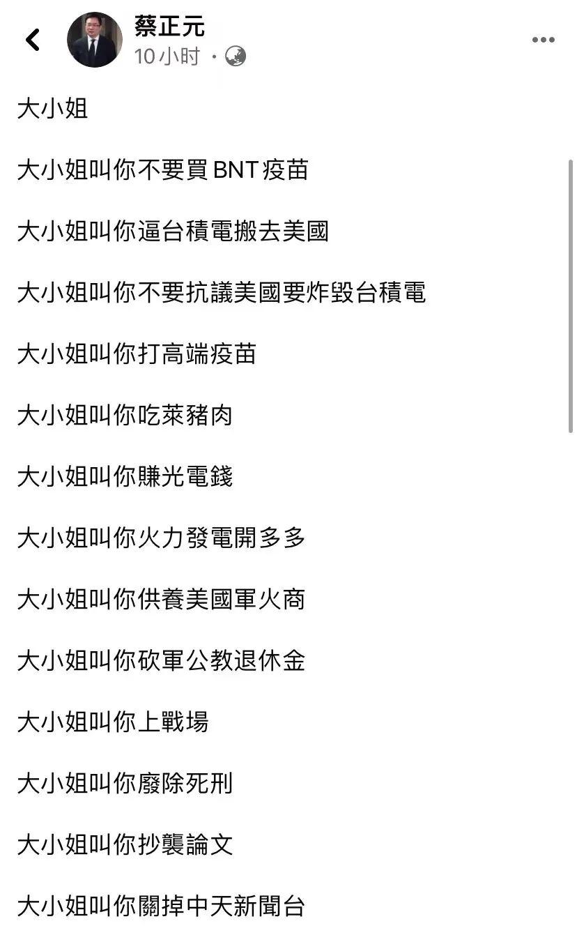 蔡英文 中時新聞網圖片 儘管蔡辦、李大維等皆予以否認,但台灣民眾的憤怒顯然已被點燃。“大小姐”一夕之間成為火爆台灣的流行語,島內網友也自發使用“大小姐”一詞造句,諷刺民進黨當局的種種惡行。 國民黨籍前民代蔡正元在社交媒體發文,列出了“大小姐”的一連串黑歷史。包括:叫你不要買BNT疫苗、叫你逼台積電搬去美國、叫你不要抗議美國要炸毀台積電、叫你打“高端”疫苗、叫你吃“萊豬”、叫你供養美國軍火商、叫你上戰場、叫你抄襲論文……