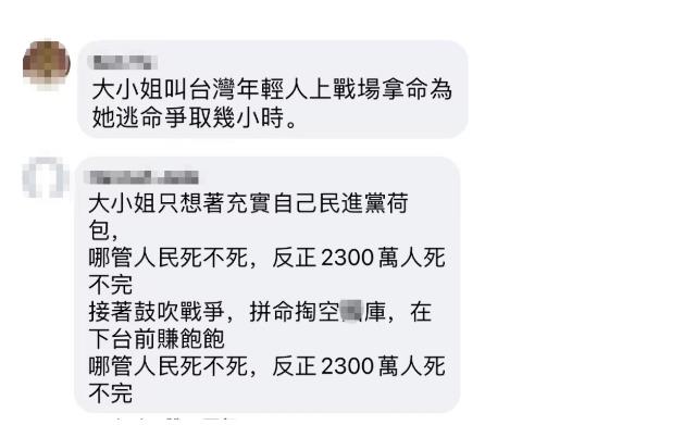 更有台灣網友憤怒於“大小姐”任內,不斷挑動兩岸關係,害得台海不再風平浪靜,抨擊蔡英文只在乎讓民進黨撈錢,掏空島內公庫,不管民眾死活,不惜讓台灣年輕人充當炮灰,為她爭取逃跑時間。