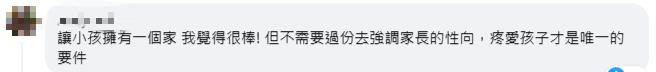 “讓小孩擁有一個家我覺得很棒!但不需要過分去強調家長的性向,疼愛孩子才是唯一的條件”