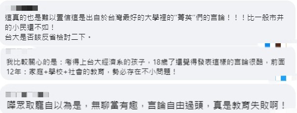 台大經濟系 圖源:台灣《聯合報》 據台灣聯合新聞網報導,台大經濟系學生會長選舉,其中一組陳姓及謝姓候選人提出政見為:“大四畢業母胎單身進行結紮手術”、“強制女生穿高中制服上微積分課”、“加設刷卡權限,BMI20以上禁止搭乘電梯”等16項。 台灣《中國時報》稱,因涉及性別歧視,該舉在網路上引起撻伐,該組候選人隨後在社交媒體臉書公開道歉,稱對特定族群並無惡意,也沒有私人仇恨,只是不成熟的行為以及玩笑話尺寸拿捏的不恰當,會停止選舉相關一切活動並對自己的言行負責。 台大經濟系21日發表聲明,這組候選人多項政見內容已違反相關規定,系方已通報台大“性平委員會”,後續程式將依“性平會”調查結果及台灣大學學生個人獎懲辦法辦理,並啟動輔導機制。 台教育部門負責人潘文忠說,這種行為不能為社會所接受,也不符教育本質。任何歧視語言的主張,都不是教育上所樂見。對於一些個案涉及歧視,要求學校必須瞭解,並適當輔導。 台灣銘傳大學廣播電視學系主任杜聖聰痛批,學生認為歧視受言論自由保障,但這樣的言論出了校園是會引起公憤的,大學讓人崇敬的是風骨,但當學生嚴重損害校譽的結果,卻是隻丟“性平會”處理,該負責的教育單位躲在“性平”保護傘下,沒有任何道歉,這是教育的淪喪。 此事在網路上引起熱議,有島內網友表示“難以置信只是出自於台灣最好的大學裡的‘菁英’們的言論!!!比一般市井的小民還不如!台大是否該反省檢討二下。”“考得上台大經濟系的孩子,18歲了還覺得發表這樣的言論很酷,前面12年:家庭+學校+社會的教育,勢必存在不小問題!”還有網友諷刺,“嘩眾取寵自以為是,無聊當有趣,言論自由過頭,真是教育失敗啊!”
