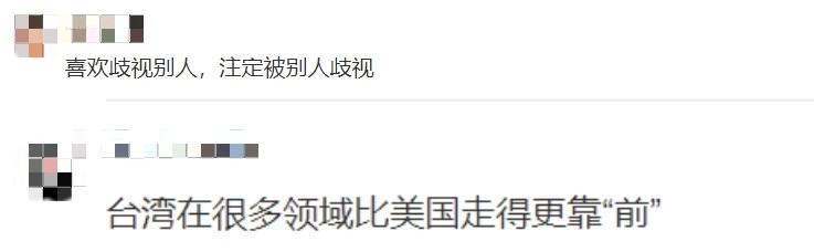 消息傳到大陸,有網友發表言論,“喜歡歧視別人,注定被別人歧視”,也有網友諷刺道:“台灣在很多領域比美國走得更靠‘前’。”