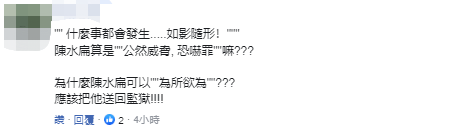 也有網友說,“陳水扁算是‘公然威脅,恐嚇罪’嗎?為什麼陳水扁可以‘為所欲為’?應該把他送回監獄!” ↓